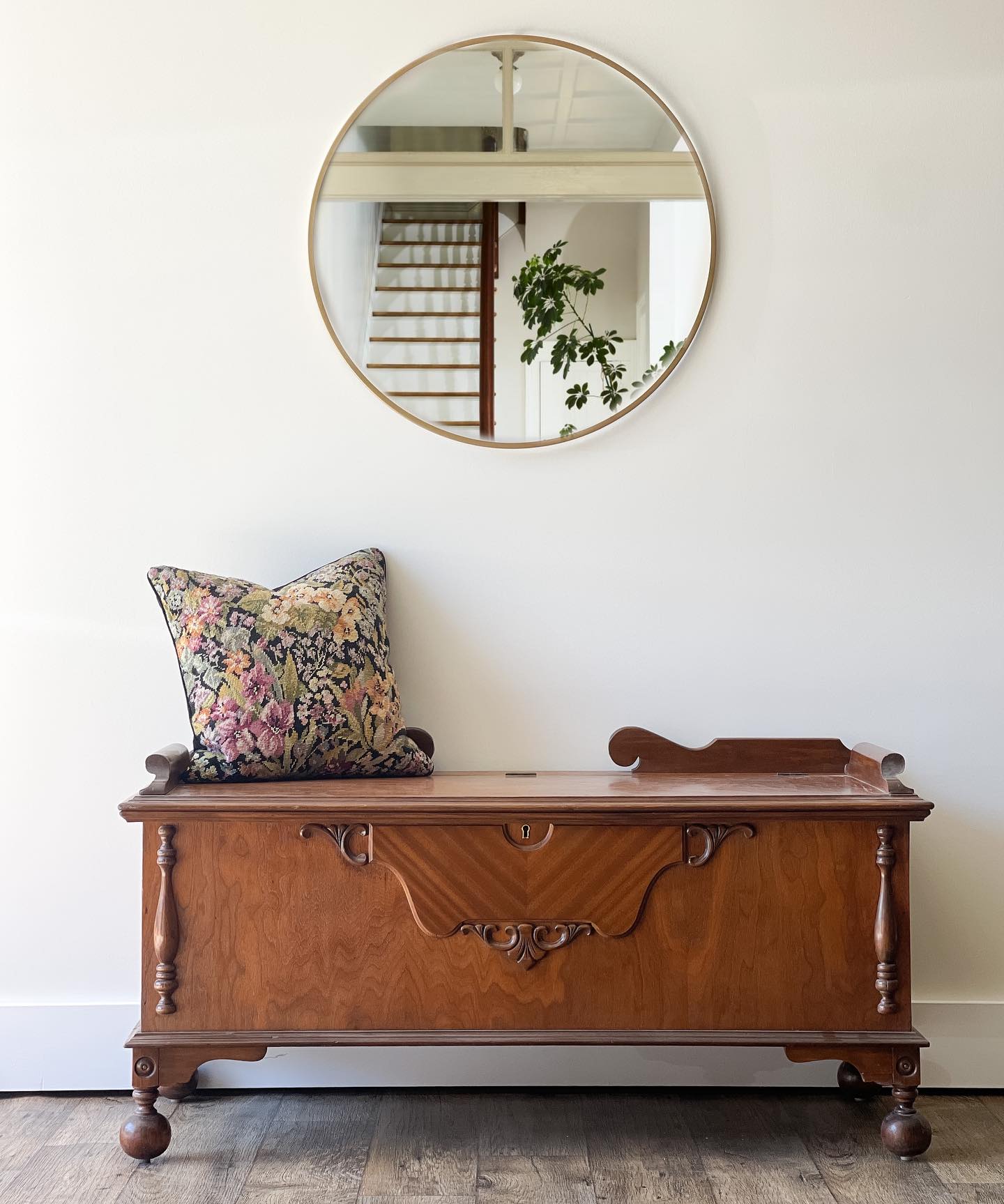 Let this antique Cavalier cedar chest be a piece to show off in your home. Unlike most cedar chests that sit directly on the floor, this one has stately round bun feet that give it both height and character. Gorgeous detailing adorns the front and top. It would be perfect used in a hallway or entryway as a bench or as blanket storage.
